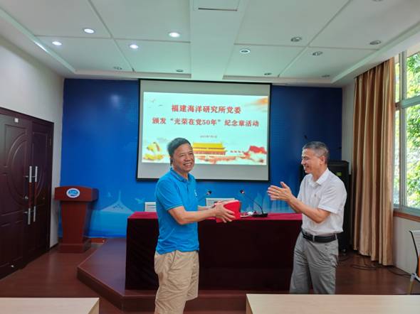 为庆祝中国共产党成立104周年,推动深入贯彻中央八项规定精神学习教育走深走实,在全所营造红色基因传承和激励担当的浓厚氛围,7月1日上午,福建海洋研究所党委举办“七一”专题党课暨“光荣在党50年”纪念章颁发活动。全所在职党员和离退休支部党员代表共40余人参加了活动。