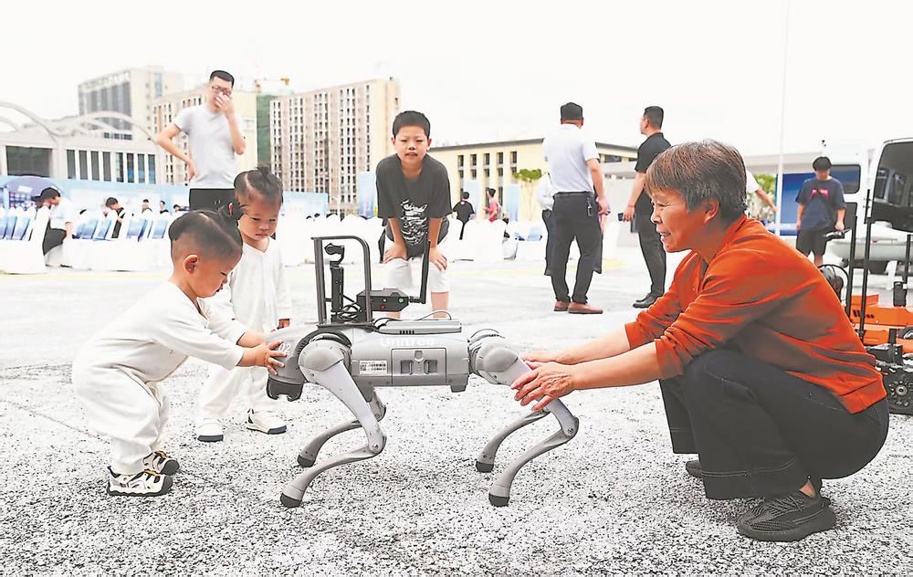 省科技活动周主会场上展出的应急消防侦查四足机器人吸引众多市民前来观看。