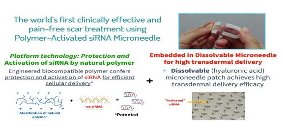 新加坡一所高等教育学院开发了世界上第一个使用小干扰RNA(siRNA)微针治疗病理性瘢痕的临床有效和无痛疗法。这项专利技术包括一种含有活化siRNA的可溶解微针,用于疤痕治疗。该团队目前正致力于临床试验。